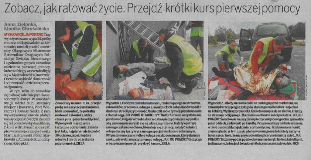 • Przeprowadzenie krótkiego pokazu udzielania pierwszej pomocy “postępowanie z osobą nieprzytomną” w ramach turnieju dla pierwszoklasistów w Mysłowicach “Bezpieczna droga do szkoły”.